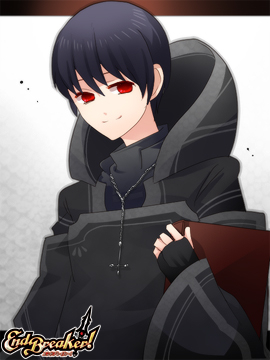 黒の短髪、赤いヤンデレ目、中性的、黒衣、露出なし。